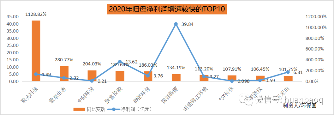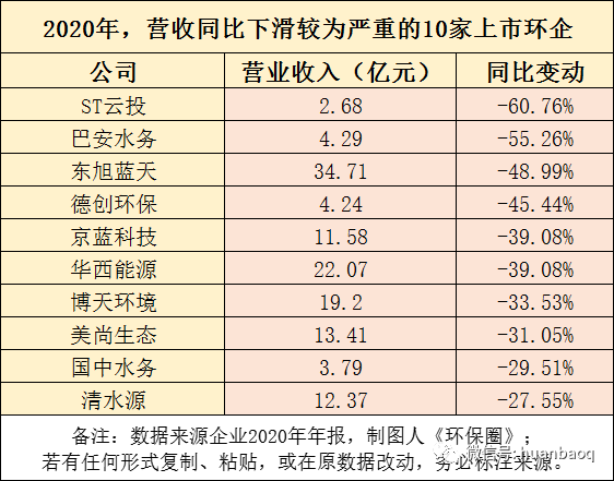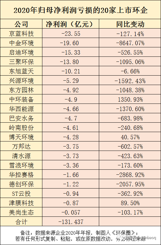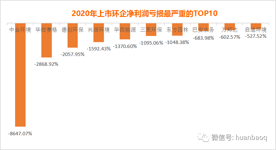 在外界宏觀條件不利、疫情生死攸關(guān)的2020年,仍有一些出類拔萃的上市環(huán)企脫穎出來,從凈利潤增速來看,2020年增速較快TOP10上市環(huán)企非常有看點(diǎn)(如圖八所示)。既有以買賣股權(quán)實(shí)現(xiàn)業(yè)績騰飛的聚光科技,也有前幾年負(fù)面纏身,疫情之下實(shí)現(xiàn)翻盤的中創(chuàng)環(huán)保和淪為*ST科林,還有被PPP拖累,引國資混改的蒙草生態(tài)和節(jié)能鐵漢,以及受疫情影響較小一線固廢名企,如僑銀環(huán)保、玉禾田、浙能錦江環(huán)境、玉禾田、深圳能源等。圖八:2020年環(huán)保上市企業(yè)凈利潤增速較快TOP10首先,凈利潤增幅最大當(dāng)屬聚光科技。2020年歸母凈利潤實(shí)現(xiàn)4.89億元,同比增長了1128.82%,主要原因是公司將持有的上海安譜實(shí)驗(yàn)公司25.18%股權(quán),擬以3.6億元價(jià)格轉(zhuǎn)讓給廣州德福、杭州青丘。其次是被PPP拖累,遭遇生死劫的蒙草生態(tài)。據(jù)悉,蒙草生態(tài)業(yè)績實(shí)現(xiàn)大幅增長得益于旗下秦草、藏草、新草等子公司的運(yùn)營良好,鞏固其核心競爭力。其中,秦草經(jīng)過激烈競標(biāo),在眾多國內(nèi)外知名企業(yè)中勝出,拿下22億元EPC總承包合同,還有子公司快樂小草的足球場建設(shè)、走路草坪等業(yè)務(wù)業(yè)發(fā)展迅猛。還有,連虧2年,終于在2020成功扭虧為盈的中創(chuàng)環(huán)保(原三維絲)也值得一提。有分析人士認(rèn)為,隨著原股東“淡出”,上海中創(chuàng)控股后,雖然從經(jīng)營數(shù)據(jù)上看,已有好轉(zhuǎn)趨勢,但要消除持續(xù)多年的負(fù)面影響還需觀察。最后是受疫情影響較小,又趕上垃圾分類、市政環(huán)衛(wèi)好時(shí)候的僑銀環(huán)保。2020年?duì)I收同比增長28.87%,凈利潤大增186.03%,主要是去年疫情免收增值稅、環(huán)衛(wèi)運(yùn)營項(xiàng)目充沛等影響。接下來,這些企業(yè)2020年經(jīng)營狀況不免有點(diǎn)慘淡了,真可謂旱的旱死,澇的澇死。在111家上市環(huán)企中,2020年歸母凈利潤同比下滑的有26家,虧損有20家(如圖九所示),累計(jì)虧損金額高達(dá)132億元,京藍(lán)科技、中金環(huán)境、啟迪環(huán)境、三聚環(huán)保、東旭藍(lán)天都虧損了10億元以上。可喜的是,博天環(huán)境雖然繼續(xù)虧損,但虧損幅度收窄,相較于上年同期增長了40.57%。圖九:2020年歸母凈利潤實(shí)現(xiàn)虧損的20家上市環(huán)企如果要在這20家虧損企業(yè)中,找到2020上市環(huán)企虧損幅度最大的“十大虧損王”,如圖十所示中金環(huán)境、德創(chuàng)環(huán)保、華控賽格、興源環(huán)境、三聚環(huán)保、東方園林、巴安水務(wù)、萬邦達(dá)、啟迪環(huán)境、清水源都“榜上有名”。圖十:2020上市環(huán)企虧損幅度最大的“十大虧損王”中金環(huán)境成為當(dāng)之無愧的“虧損王”,2020年凈虧損高達(dá)19.6億元,相較于2019年的2292萬元,下降了8647.07%,驚呆業(yè)界。據(jù)筆者觀察,其實(shí)從2018年中金環(huán)境就已經(jīng)開始走下坡路了。2018年,凈利潤4.3億元,比上年下滑27.17%,2019業(yè)績繼續(xù)下滑,凈利潤僅為2292萬,到了2020年,經(jīng)營更加惡化,虧損了19.6億元。巨虧原因主要受新冠肺炎疫情及市場環(huán)境影響,子公司金泰萊、中咨華宇無法完成業(yè)績承諾,面臨巨額資產(chǎn)減值問題,預(yù)計(jì)計(jì)提商譽(yù)減值金額共計(jì)17.50億元至19億元之間。同樣經(jīng)營惡化,由盈轉(zhuǎn)虧還有華控賽格、德創(chuàng)環(huán)保,這兩家企業(yè)2019年同期凈利潤分別為594萬元、625萬,到了2020年,受疫情及全球經(jīng)濟(jì)衰退的影響,環(huán)保工程業(yè)務(wù)出現(xiàn)下滑,凈利潤分別虧損約1.66億元、1.22億元,同比下降2868.92%、2057.95%。縱觀這些虧損上市環(huán)企,雖然每家企業(yè)跌倒原因不同,但年報(bào)都不約而同提及幾個(gè)方面:國內(nèi)外新冠疫情導(dǎo)致復(fù)工復(fù)產(chǎn)、項(xiàng)目結(jié)算周期延遲和政府支付能力下滑;環(huán)保市場競爭加劇,導(dǎo)致項(xiàng)目毛利減少;部分環(huán)保細(xì)分領(lǐng)域,僧多肉少,市場趨于飽和。老舊項(xiàng)目回款不暢,應(yīng)收賬款居高不下,導(dǎo)致壞賬減值計(jì)提損失。如東江環(huán)保年報(bào)提到,營收下滑主要系疫情影響,工業(yè)企業(yè)開工減少,導(dǎo)致危廢處理量下降;且隨著新增產(chǎn)能陸續(xù)投產(chǎn),行業(yè)競爭日趨激烈,市場收運(yùn)和處理費(fèi)價(jià)格有所下滑。再如中環(huán)裝備年報(bào)提到,面對傳統(tǒng)煙氣治理市場飽和,獲取大氣減排訂單變得越來越難,對公司業(yè)績造成不小的影響。無論如何,凡此過往皆為序章,最難的2020年都已過去了,面向“十四五”,所有企業(yè)都將面臨新的機(jī)遇和挑戰(zhàn)。業(yè)績好的2021年再接再厲,續(xù)寫輝煌;業(yè)績差的則要再接再厲,打個(gè)漂亮的翻身仗。未來,《環(huán)保圈》將持續(xù)關(guān)注業(yè)內(nèi)企業(yè)動態(tài),觀察行業(yè)大勢,為讀者奉獻(xiàn)更多精彩的分析。