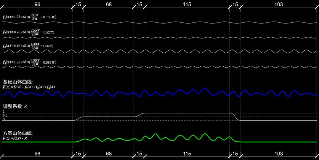 峰叢形態(tài)是由四組三角函數(shù)曲線合成得出的,通過函數(shù)控制,保證曲線的曲率變化均勻,使其具有良好的視覺形態(tài),也為后期深化工作提供了詳細的數(shù)據(jù)支持。