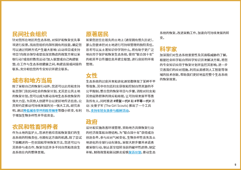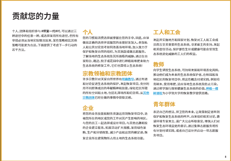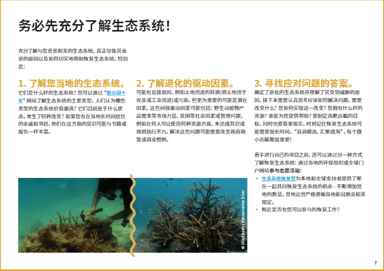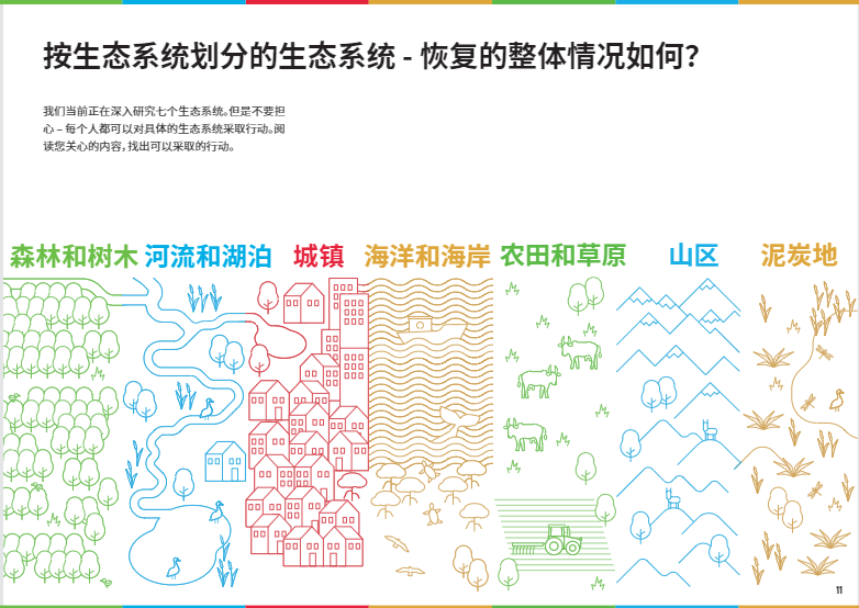 在本文中,我們將重點(diǎn)介紹八個(gè)關(guān)鍵的生態(tài)系統(tǒng)類型,以及如何開展修復(fù)工作使它們恢復(fù)活力。如果你有志于加入#修復(fù)一代,#RestorationGeneration,想深入了解改善本地生態(tài)系統(tǒng)的方法,歡迎大家下載閱讀由”聯(lián)合國十年”倡議發(fā)布的《生態(tài)系統(tǒng)修復(fù)手冊》,一本有關(guān)治愈地球的實(shí)用指南??