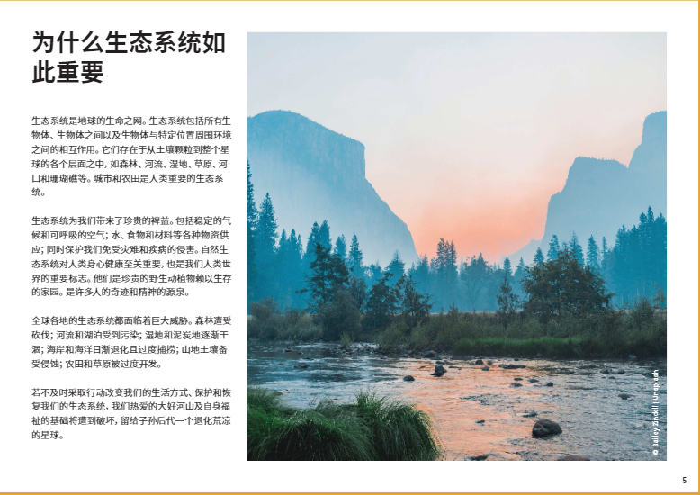 大至森林,小至池塘,都是生態(tài)系統(tǒng)。各式各樣的生態(tài)系統(tǒng)對人類社會(huì)至關(guān)重要,它們不僅為我們提供了水、食物、建筑材料和許多其他必需品,還有利于整個(gè)地球的利益和福祉,比如提供氣候保護(hù)和生物多樣性保護(hù)。