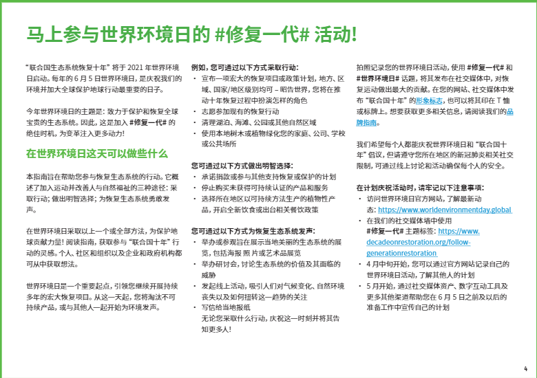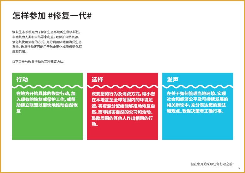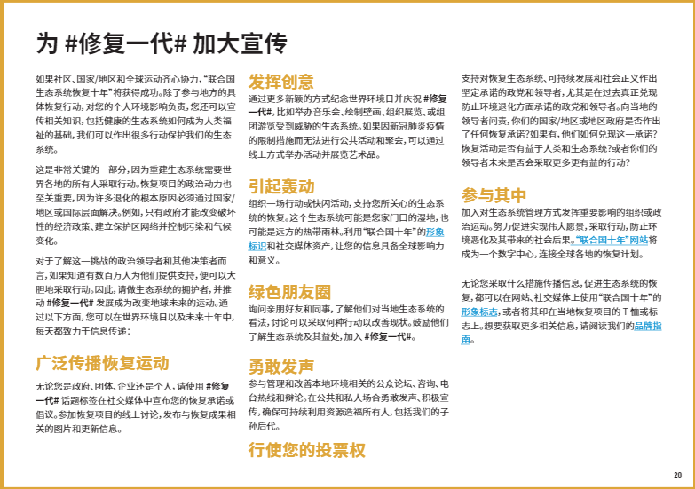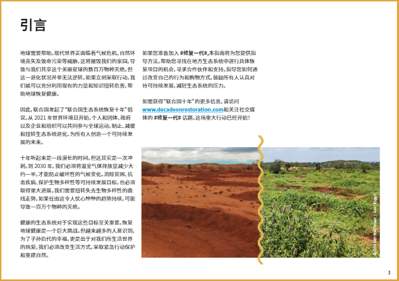 今年6月5日世界環(huán)境日將正式啟動(dòng) “聯(lián)合國生態(tài)系統(tǒng)恢復(fù)十年”倡議。這是一項(xiàng)長達(dá)十年的倡議,旨在調(diào)動(dòng)全球力量,共同制止并扭轉(zhuǎn)自然世界的衰退。在過去的幾個(gè)月中,有個(gè)詞頻繁地被科學(xué)家、政府官員和環(huán)境活動(dòng)家提及:生態(tài)系統(tǒng)修復(fù)。今年6月5日世界環(huán)境日將正式啟動(dòng) “聯(lián)合國生態(tài)系統(tǒng)恢復(fù)十年”倡議。這是一項(xiàng)長達(dá)十年的倡議,旨在調(diào)動(dòng)全球力量,共同制止并扭轉(zhuǎn)自然世界的衰退。