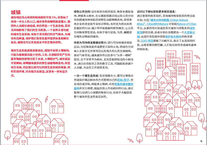 城鎮(zhèn)看起來就像是生態(tài)沙漠。房屋、道路和工廠之間幾乎沒有植被生長的空間。廢棄物和污染破壞水道、土壤和空氣。但是城市具有巨大的恢復(fù)潛力。公民團(tuán)體和市政當(dāng)局可以清理水道;種植吸引蜜蜂的植物;并在公園、學(xué)校和其他公共場所創(chuàng)造城市林地和其他野生動(dòng)植物棲息地。減少割草的頻率不僅能節(jié)約城市的開支,并且可以使自然蓬勃發(fā)展。透水性人行道以及城市濕地可防止洪水和污染。改造受污染的工業(yè)區(qū),使之變身成為自然和娛樂場所。你知道嗎? 如今在紐約的中央公園,載有記錄的鳥類高達(dá)280多種。在聯(lián)合國環(huán)境規(guī)劃署和聯(lián)合國糧食及農(nóng)業(yè)組織的領(lǐng)導(dǎo)下,“聯(lián)合國生態(tài)系統(tǒng)恢復(fù)十年”倡議將匯集全球的政治支持、科學(xué)研究和財(cái)政力量,開展大規(guī)模的生態(tài)修復(fù)工作,致力于恢復(fù)數(shù)百萬公頃的陸地和水生生態(tài)系統(tǒng)。