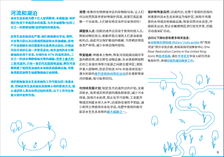 安全且充足的水源已成為一種奢侈品。污染、過度捕撈、基礎(chǔ)設(shè)施建設(shè)以及因灌溉、工業(yè)和家庭用水增加而對水資源無休止的攫取正導(dǎo)致淡水生態(tài)系統(tǒng)不斷退化。恢復(fù)意味著減輕污染、減少并有效處理廢棄物、對水源和魚類資源的開采進(jìn)行可持續(xù)管理以及恢復(fù)地表和地下的植被。