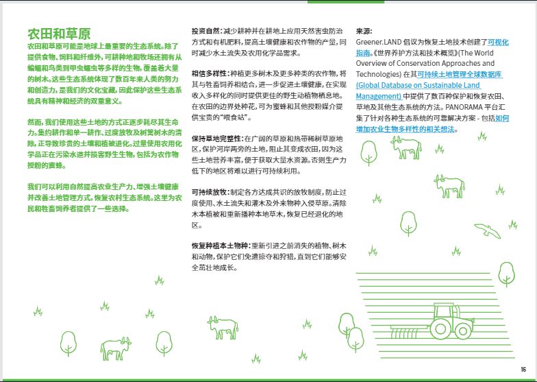 對土地的過度墾殖以及不合理的耕作利用、水土流失、過量使用化肥和農(nóng)藥正在耗盡農(nóng)田中土壤的活力?;謴?fù)農(nóng)田的方法包括減少耕種,更多地使用天然肥料和病蟲害防治方法以及種植包括樹木在內(nèi)的多種農(nóng)作物。這些行動(dòng)有助于重建土壤中的碳儲(chǔ)量,使其更加肥沃,確保各國在不占用更多耕地面積的情況下養(yǎng)活不斷增長的人口。農(nóng)田的恢復(fù)還為野生動(dòng)植物創(chuàng)造了棲息地。
