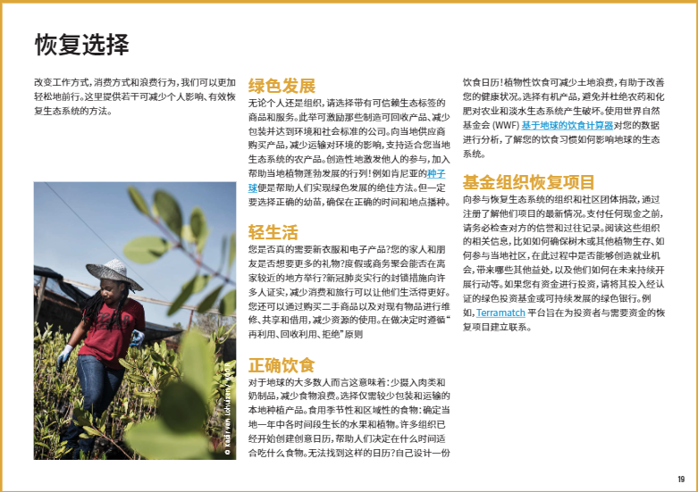 人們砍伐并清空森林和樹木,將林地轉(zhuǎn)化為耕地、牧場、城市等用地以滿足人類對土地和資源的渴求。伐木、劈柴、污染、有害物種入侵和野火正在摧毀所剩不多的林地?;謴?fù)森林生態(tài)系統(tǒng)意味著大規(guī)模植樹造林并減輕森林的壓力,使樹木恢復(fù)自然生長。糧食系統(tǒng)是森林流失的一大主要驅(qū)動(dòng)因素。重新考慮我們?nèi)绾畏N植及消費(fèi)糧食,有助于減輕森林與日俱增的壓力。因土壤的退化而遭廢棄的農(nóng)田可能是恢復(fù)森林的理想之地,這也意味著繁忙的農(nóng)場和村莊周邊蘊(yùn)藏著培育成片森林和林地的機(jī)會(huì)。