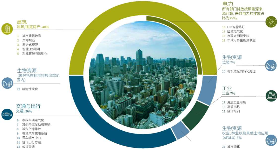 實(shí)現(xiàn)零碳城市愿景,以建筑、電力、生物資源、工業(yè)、交通與出行等方面作為減碳的重要空間載體。