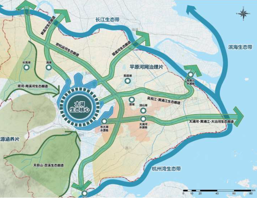 長(zhǎng)三角一體化示范區(qū)水網(wǎng)生態(tài)以及太湖流域共同保護(hù)格局圖