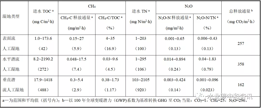 將CH4和N2O折算成CO2當(dāng)量后得出的總釋放通量為:水平潛流(358 mg CO2/m2×h)>表面流(257mg CO2/m2×h)>垂直流(162 mg CO2/m2×h)。可見,垂直流人工濕地的GHG釋放通量最小。其實(shí),垂直流濕地占地面積也最小,這更加凸顯了其GHG釋放總量明顯小于水平流和表面流濕地的特征。另外,表1還顯示,不同人工濕地中CH4都是主要GHG類型,對總釋放量貢獻(xiàn)率均>60%。因此,控制CH4釋放應(yīng)成為人工濕地減少GHG排放的關(guān)鍵。