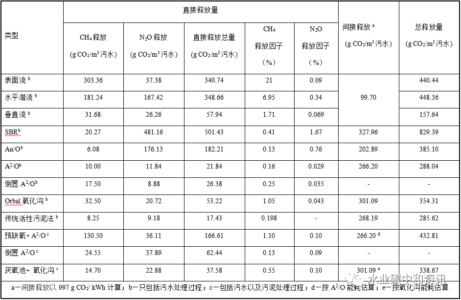 除直接釋放外,污水處理過程中GHG釋放還包括間接釋放(能源/藥耗等)。人工濕地運(yùn)行能耗一般小于0.1 kWh/m3(取0.1),而An/O、A2/O、SBR、氧化溝、傳統(tǒng)活性污泥法等活性污泥工藝平均能耗分別為0.283、0.267、0.336 、0.302和0.269 kWh/m3 ??梢?,人工濕地間接釋放量(99.7 g CO2/m3)遠(yuǎn)遠(yuǎn)小于傳統(tǒng)工藝的最小間接釋放量(An/O工藝:202.89 g CO2/m3)。即便如此,表面流和水平潛流人工濕地的GHG總釋放量(直接+間接)仍與傳統(tǒng)活性污泥法旗鼓相當(dāng),甚至更高。唯有垂直流人工濕地GHG總釋放量遠(yuǎn)低于所有活性污泥工藝。因此,在建設(shè)成本及運(yùn)行狀況允許的情況下應(yīng)盡可能選用垂直流人工濕地。