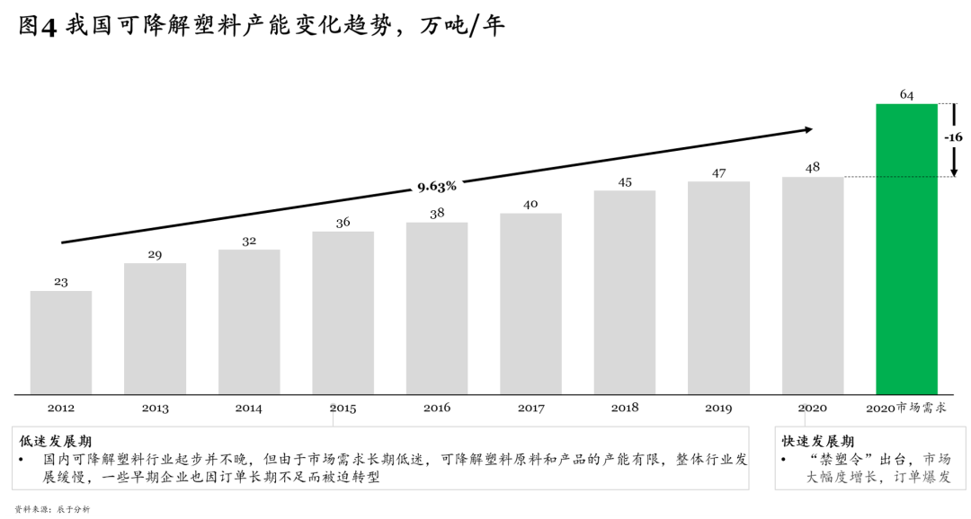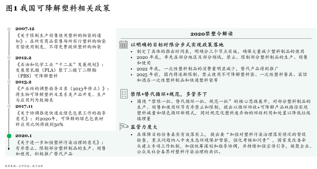 “白色污染是伴隨人類社會、經(jīng)濟(jì)發(fā)展過程中面臨的一個巨大挑戰(zhàn),21世紀(jì)以來,全球興起可降解風(fēng)潮,多個國家發(fā)布趨嚴(yán)政策推動行業(yè)發(fā)展。2020年1月,我國也正式從“限塑”轉(zhuǎn)為“禁塑”,繼而帶動可降解塑料行業(yè)從早期的低迷發(fā)展期進(jìn)入高速發(fā)展期。由于經(jīng)歷了長期的低迷發(fā)展,當(dāng)前行業(yè)競爭較為混亂且尚未定局,把握住核心要素便有可能成為龍頭企業(yè),領(lǐng)航黃金時代。 我國可降解塑料市場早在2012年就已經(jīng)起步,但由于早期市場需求低迷,原料成本過高、產(chǎn)能有限,行業(yè)整體發(fā)展緩慢,進(jìn)入市場較早的一些企業(yè)甚至因訂單長期不足而被迫轉(zhuǎn)型。直到2020年1月,《關(guān)于進(jìn)一步加強(qiáng)塑料污染治理的意見》(以下簡稱“禁塑令”)出臺,要求有序禁止、限制部分塑料制品的生產(chǎn)、銷售和使用,積極推廣替代產(chǎn)品,正式從“限塑”轉(zhuǎn)為“禁塑”(見圖1)。