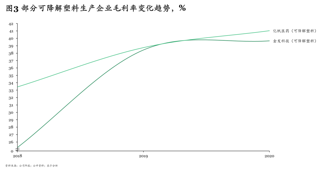 與此同時,可降解塑料產(chǎn)品價格近一年來攀升,例如禁塑令前PLA價格為2萬元/噸,現(xiàn)在一些地方的市場價已高達(dá)5萬元/噸。這直接提升了行業(yè)整體盈利水平,例如金發(fā)科技、億帆醫(yī)藥等龍頭企業(yè)2019、2020年的毛利率均接近40%,相比2018年大幅提升(見圖3)。