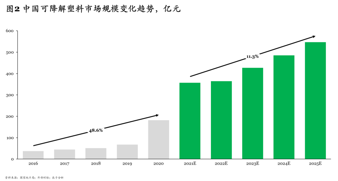 受此影響,作為傳統(tǒng)塑料替代產(chǎn)品的可降解塑料市場大幅度增長,訂單暴增,我們預(yù)計“十四五”期間,可降解塑料市場將以11.3%的年復(fù)合增速,到2025年實現(xiàn)500億元以上的收入規(guī)模(見圖2)。
