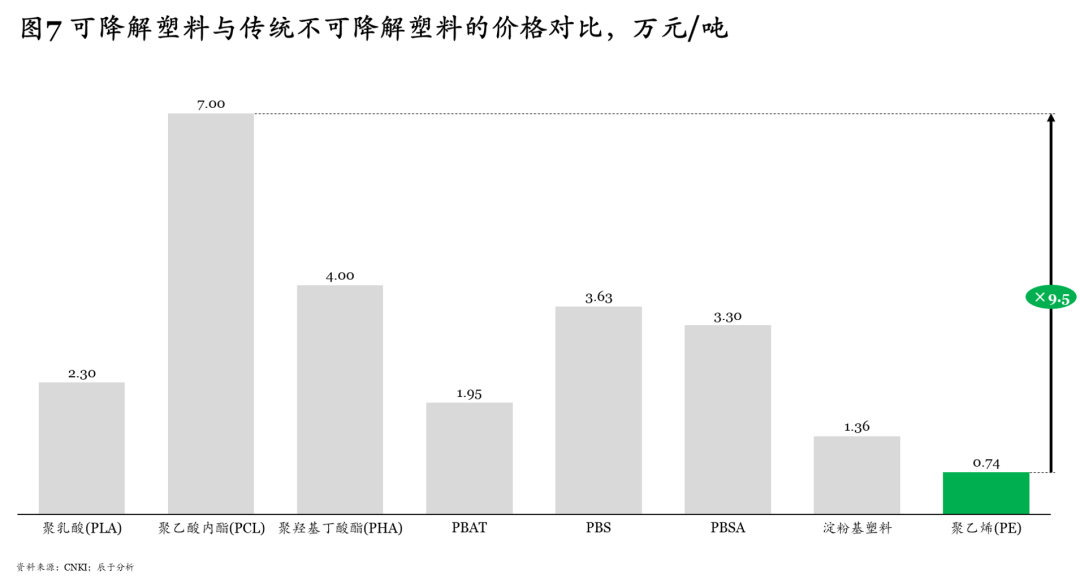 不可降解塑料如PP、PET、 PE等價格較低,可降解塑料價格明顯高于它們,目前主流可降解塑料如PLA、PHA、 PBAT的價格分別在1.6-3萬元/噸、4萬元/噸、1.4-2.5萬元/噸左右,是PE價格的2~5倍, 而PCL 的價格甚至高達(dá)7萬元/噸,是PE價格的9.5倍(見圖7)。