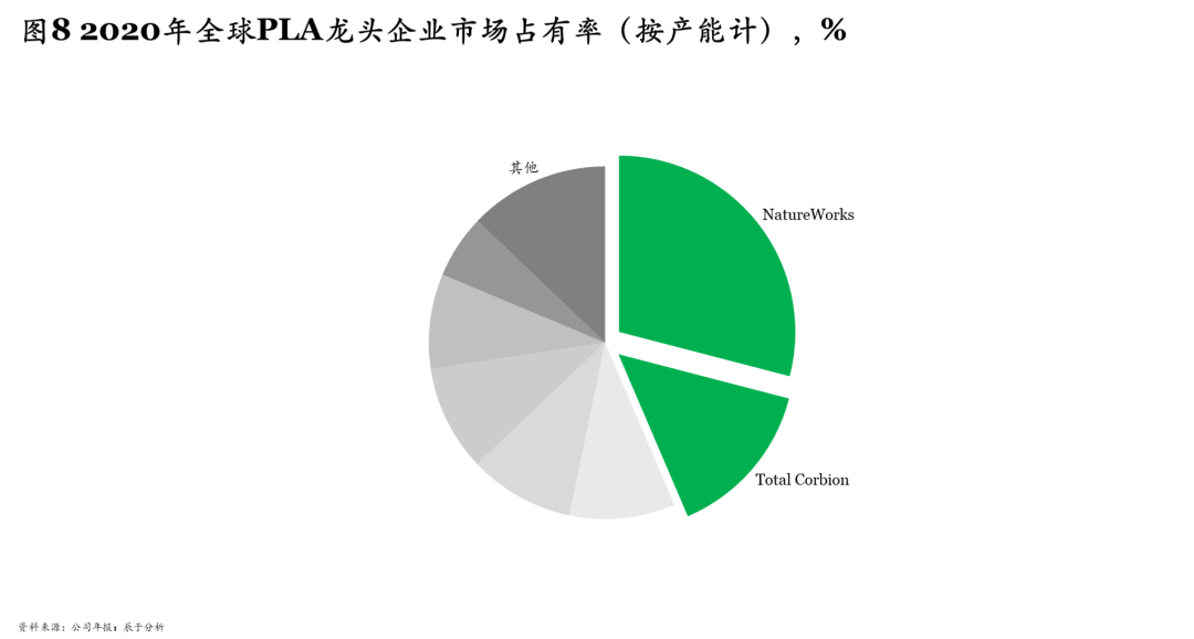 原料價格高、技術(shù)水平較低、產(chǎn)能利用率較低,是導(dǎo)致我國可降解塑料價格居高不下的三大主因。以PLA為例,一步法雖然成本低但品質(zhì)差,二步法品質(zhì)優(yōu),是目前主流合成路線,但成本高,是一步法的2.3倍左右。如何實現(xiàn)高純度、低成本是提升滲透率、贏得市場競爭的關(guān)鍵:例如美國NatureWorks、法國 Total 和荷蘭 Corbion 的合建公司Total Corbion由于擁有PLA制備中間體—丙交酯的低成本高純度制備工藝而引領(lǐng)全球市場,2020年的產(chǎn)能占有率分別達(dá)到29.04%和14.52%(圖8)。