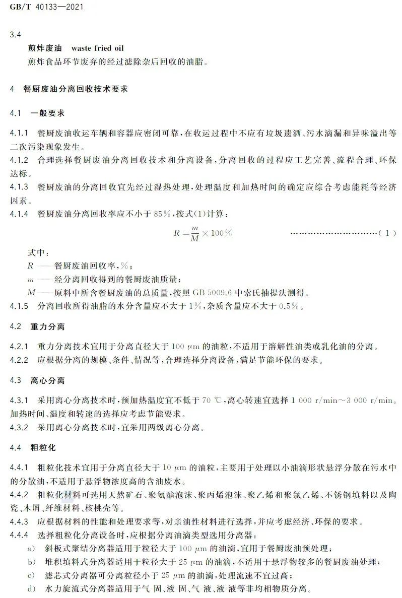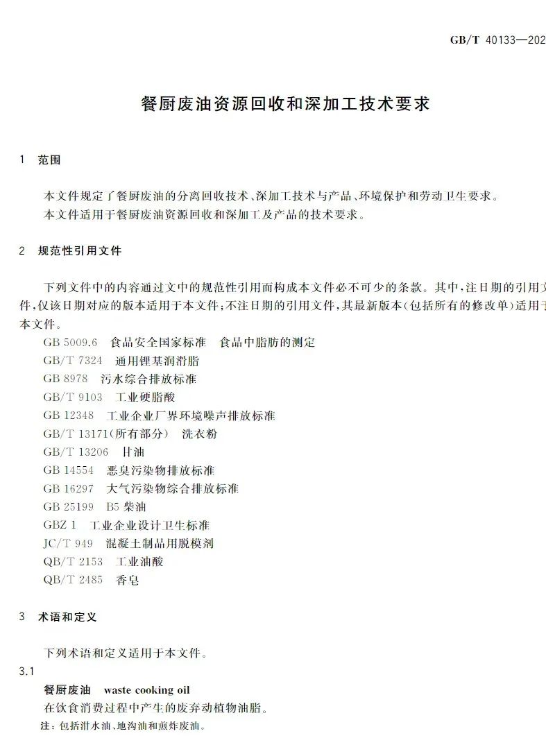 該國(guó)標(biāo)對(duì)餐廚廢油的分離回收技術(shù)、深加工技術(shù)與產(chǎn)品及環(huán)境保護(hù)和勞動(dòng)衛(wèi)生做出規(guī)范要求,是我國(guó)第一項(xiàng)餐廚廢油回收和深加工技術(shù)的國(guó)家標(biāo)準(zhǔn),改觀了餐廚廢油資源回收和深加工處于有技術(shù)、無(wú)標(biāo)準(zhǔn)的狀態(tài),對(duì)于餐廚廢油資源回收和深加工及產(chǎn)品具有深遠(yuǎn)的指導(dǎo)性意義。