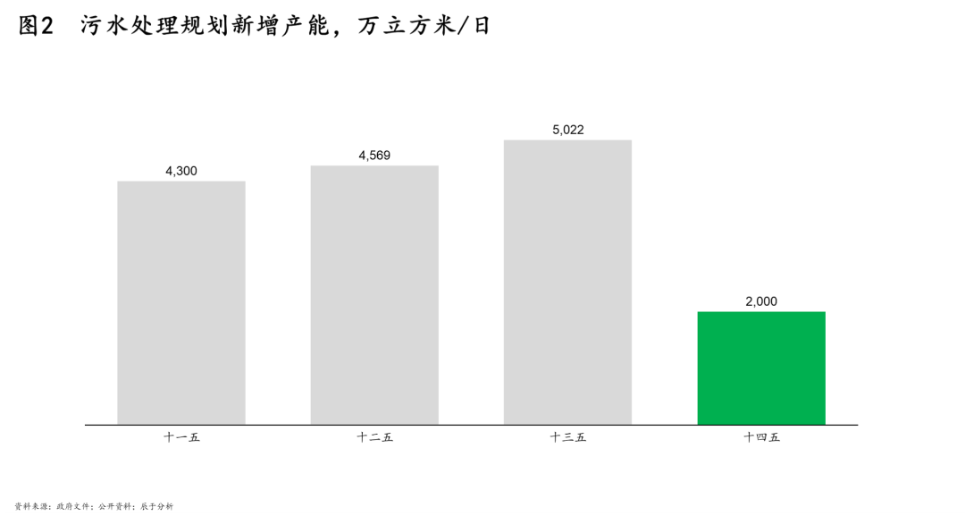 一是污水處理日漸成熟。近年我國城鎮(zhèn)污水處理任務(wù)已基本完成,城市污水處理率已經(jīng)達(dá)到95%以上,在“十四五”規(guī)劃中的污水處理新增產(chǎn)能也出現(xiàn)明顯下降(見圖2)。在污水處理漸趨飽和的情況下,先前遭到忽視的污泥處理問題重新得到關(guān)注。