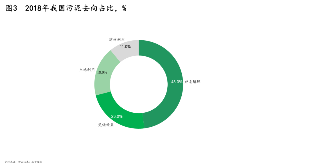 在這樣的條件下,大部分地區(qū)對污泥處理以最便利的填埋為主。以2018年為例,我國污泥去向近半成為應(yīng)急填埋(見圖3),盡管填埋并非最合適的污泥處理方式:占用土地面積大,場地不宜尋找;往往治標(biāo)不治本,因污泥含有重金屬及病菌,遇水極易造成二次污染,包括有害成分滲漏造成地下水污染、污泥中的營養(yǎng)物質(zhì)使大量病原菌滋生繁衍等。