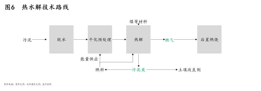 而在資源回收上,相比好氧堆肥,干化焚燒及熱水解則是更好的資源化方式,值得重點(diǎn)關(guān)注。干化焚燒的技術(shù)路線如圖5所示,作為最快捷、最徹底實現(xiàn)污泥減量化、穩(wěn)定化、無害化的最終處置技術(shù),干化焚燒后的資源化利用產(chǎn)品也更易走通;熱水解的技術(shù)路線如圖6所示,其生產(chǎn)過程清潔化,生成的污泥炭資源多樣化。