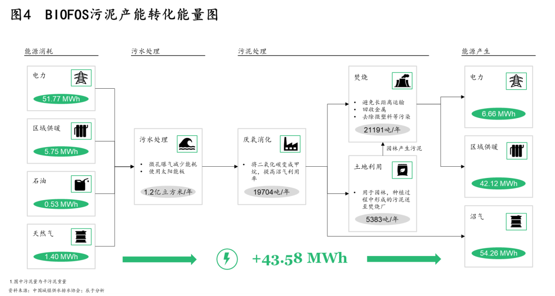 其二,30·60雙碳目標(biāo)提出后,未來污泥處理處置將以節(jié)能降耗及能源資源回收為目標(biāo),這對污泥處理提出了更為清晰的技術(shù)路徑方向。例如在能源回收上,厭氧消化是優(yōu)選途徑,如丹麥污水廠BIOFOS通過污泥消化產(chǎn)能實現(xiàn)能量盈余(見圖4)。