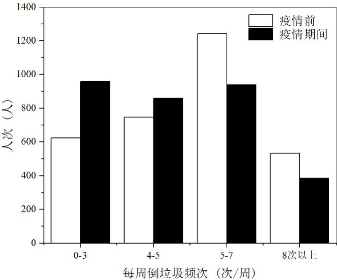 疫情導致社區(qū)垃圾分類基礎成分產(chǎn)生明顯變化,廢棄口罩大量增加,居民投放垃圾頻次顯著降低。疫情期間,人均廢棄口罩產(chǎn)生頻次約為3.7個/周,將近一半(48.2%)被調(diào)查者平均每周產(chǎn)生廢棄口罩數(shù)量在0~3個范圍;30.6%居民投放垃圾頻率降低,由疫情前5~7次向疫情期間低頻段轉(zhuǎn)變趨勢明顯,疫情越嚴重地區(qū)口罩產(chǎn)頻更高、投放垃圾頻率降低更多。針對垃圾組分變化,社區(qū)應貫徹落實垃圾分類,對涉疫垃圾分類分流收集處置,并靈活調(diào)整疫情期間垃圾清運計劃,總結居民行為規(guī)律,適時調(diào)減清運頻次降低成本。