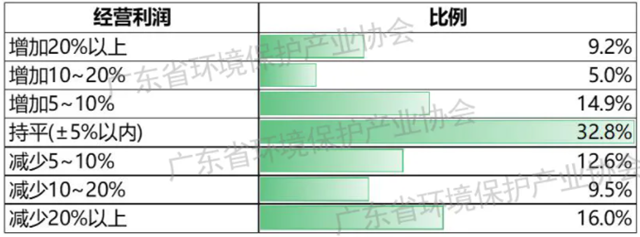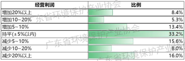 營業(yè)利潤方面,29.1%的環(huán)保企業(yè)實(shí)現(xiàn)利潤同比增長,32.8%的企業(yè)利潤與上年同期持平,38.1%的企業(yè)利潤下降。