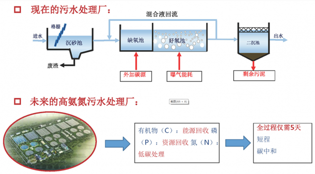 現(xiàn)在污水處理存在的問題:有機物變?yōu)镃O2(氧化-曝氣-能耗)和污泥(大 問題),磷進入污泥(加除磷藥劑),氮(氨氮-氧化-能耗,反硝化-外加碳 源-污泥量增加)。