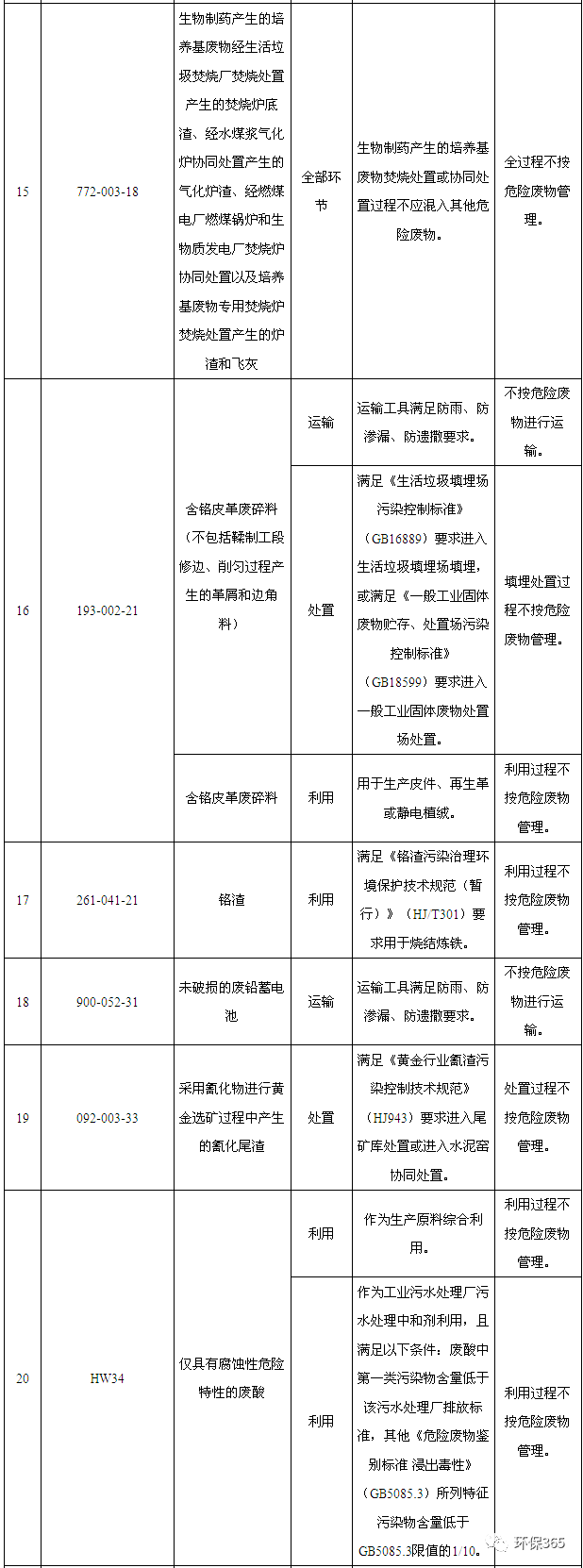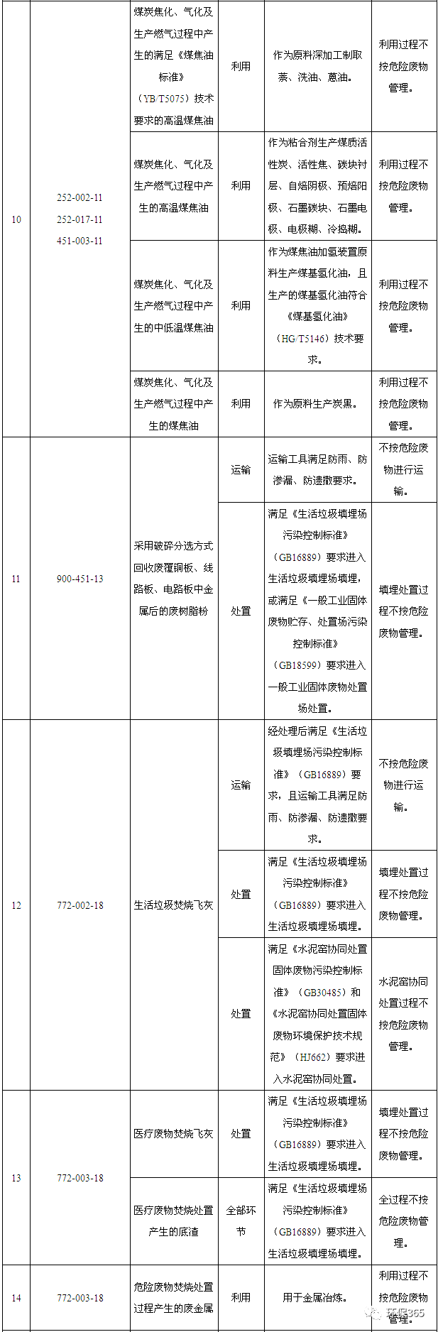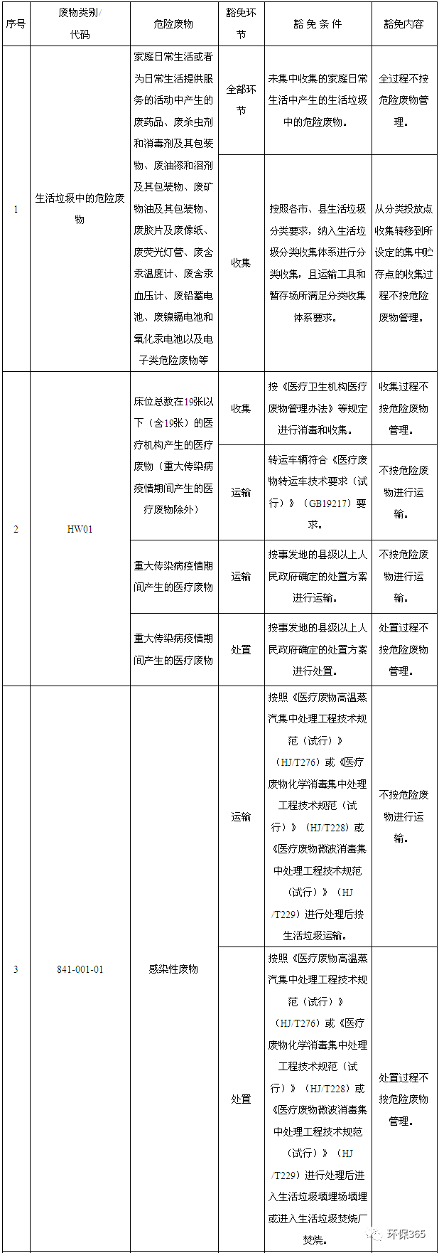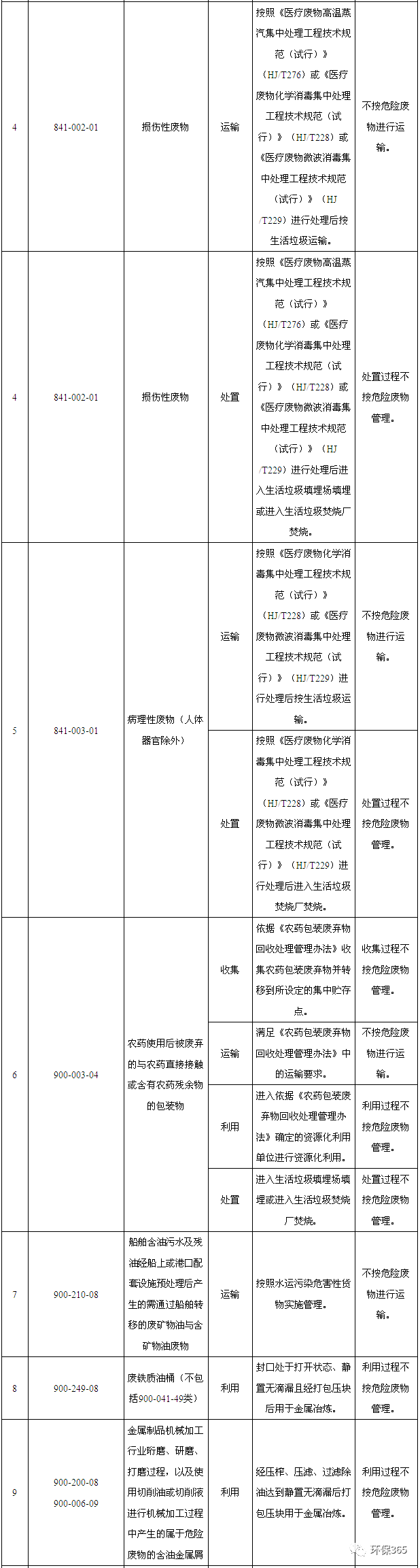 (1)家庭日常生活或者為日常生活提供服務(wù)的活動(dòng)中產(chǎn)生的廢藥品、廢殺蟲劑和消毒劑及其包裝物、廢油漆和溶劑及其包裝物、廢礦物油及其包裝物、廢膠片及廢像紙、廢熒光燈管、廢含汞溫度計(jì)、廢含汞血壓計(jì)、廢鉛蓄電池、廢鎳鎘電池和氧化汞電池以及電子類危險(xiǎn)廢物等未經(jīng)過集中收集的全部環(huán)節(jié)不按危險(xiǎn)廢物管理;按照各市、縣生活垃圾分類要求,納入生活垃圾分類收集體系進(jìn)行分類收集,且運(yùn)輸工具和暫存場(chǎng)所滿足分類收集體系要求的,從分類投放點(diǎn)收集轉(zhuǎn)移到所設(shè)定的集中貯存點(diǎn)的收集過程不按危險(xiǎn)廢物管理。(2)床位總數(shù)在19張以下(含19張)的醫(yī)療機(jī)構(gòu)產(chǎn)生的醫(yī)療廢物(重大傳染病疫情期間產(chǎn)生的醫(yī)療廢物除外)按《醫(yī)療衛(wèi)生機(jī)構(gòu)醫(yī)療廢物管理辦法》等規(guī)定進(jìn)行消毒和收集的,收集過程不按危險(xiǎn)廢物管理;轉(zhuǎn)運(yùn)車輛符合《醫(yī)療廢物轉(zhuǎn)運(yùn)車技術(shù)要求(試行)》(GB19217)要求的,不按危險(xiǎn)廢物進(jìn)行運(yùn)輸;重大傳染病疫情期間產(chǎn)生的醫(yī)療廢物,按事發(fā)地的縣級(jí)以上人民政府確定的處置方案進(jìn)行運(yùn)輸?shù)?,不按危險(xiǎn)廢物進(jìn)行運(yùn)輸;按事發(fā)地的縣級(jí)以上人民政府確定的處置方案進(jìn)行處置的,處置過程不按危險(xiǎn)廢物管理。(3)感染性廢物按照《醫(yī)療廢物高溫蒸汽集中處理工程技術(shù)規(guī)范(試行)》(HJ/T276)或《醫(yī)療廢物化學(xué)消毒集中處理工程技術(shù)規(guī)范(試行)》(HJ/T228)或《醫(yī)療廢物微波消毒集中處理工程技術(shù)規(guī)范(試行)》(HJ/T229)進(jìn)行處理后按生活垃圾運(yùn)輸?shù)模话次kU(xiǎn)廢物進(jìn)行運(yùn)輸;按照《醫(yī)療廢物高溫蒸汽集中處理工程技術(shù)規(guī)范(試行)》(HJ/T276)或《醫(yī)療廢物化學(xué)消毒集中處理工程技術(shù)規(guī)范(試行)》(HJ/T228)或《醫(yī)療廢物微波消毒集中處理工程技術(shù)規(guī)范(試行)》(HJ/T229)進(jìn)行處理后進(jìn)入生活垃圾填埋場(chǎng)填埋或進(jìn)入生活垃圾焚燒廠焚燒的,處置過程不按危險(xiǎn)廢物管理。(4)損傷性廢物按照《醫(yī)療廢物高溫蒸汽集中處理工程技術(shù)規(guī)范(試行)》(HJ/T276)或《醫(yī)療廢物化學(xué)消毒集中處理工程技術(shù)規(guī)范(試行)》(HJ/T228)或《醫(yī)療廢物微波消毒集中處理工程技術(shù)規(guī)范(試行)》(HJ/T229)進(jìn)行處理后按生活垃圾運(yùn)輸?shù)?,不按危險(xiǎn)廢物進(jìn)行運(yùn)輸;按照《醫(yī)療廢物高溫蒸汽集中處理工程技術(shù)規(guī)范(試行)》(HJ/T276)或《醫(yī)療廢物化學(xué)消毒集中處理工程技術(shù)規(guī)范(試行)》(HJ/T228)或《醫(yī)療廢物微波消毒集中處理工程技術(shù)規(guī)范(試行)》(HJ/T229)進(jìn)行處理后進(jìn)入生活垃圾填埋場(chǎng)填埋或進(jìn)入生活垃圾焚燒廠焚燒的,處置過程不按危險(xiǎn)廢物管理。(5)病理性廢物(人體器官除外)按照《醫(yī)療廢物化學(xué)消毒集中處理工程技術(shù)規(guī)范(試行)》(HJ/T228)或《醫(yī)療廢物微波消毒集中處理工程技術(shù)規(guī)范(試行)》(HJ/T229)進(jìn)行處理后按生活垃圾運(yùn)輸?shù)?,不按危險(xiǎn)廢物進(jìn)行運(yùn)輸;按照《醫(yī)療廢物化學(xué)消毒集中處理工程技術(shù)規(guī)范(試行)》(HJ/T228)或《醫(yī)療廢物微波消毒集中處理工程技術(shù)規(guī)范(試行)》(HJ/T229)進(jìn)行處理后進(jìn)入生活垃圾焚燒廠焚燒的,處置過程不按危險(xiǎn)廢物管理。(6)農(nóng)藥使用后被廢棄的與農(nóng)藥直接接觸或含有農(nóng)藥殘余物的包裝物依據(jù)《農(nóng)藥包裝廢棄物回收處理管理辦法》收集并轉(zhuǎn)移到所設(shè)定的集中貯存點(diǎn)的,收集過程不按危險(xiǎn)廢物管理;滿足《農(nóng)藥包裝廢棄物回收處理管理辦法》中的運(yùn)輸要求的,不按危險(xiǎn)廢物進(jìn)行運(yùn)輸;進(jìn)入依據(jù)《農(nóng)藥包裝廢棄物回收處理管理辦法》確定的資源化利用單位進(jìn)行資源化利用的,利用過程不按危險(xiǎn)廢物管理;進(jìn)入生活垃圾填埋場(chǎng)填埋或進(jìn)入生活垃圾焚燒廠焚燒的,處置過程不按危險(xiǎn)廢物管理。(7)船舶含油污水及殘油經(jīng)船上或港口配套設(shè)施預(yù)處理后產(chǎn)生的需通過船舶轉(zhuǎn)移的廢礦物油與含礦物油廢物按照水運(yùn)污染危害性貨物實(shí)施管理的,不按危險(xiǎn)廢物進(jìn)行運(yùn)輸。(8)廢鐵質(zhì)油桶(不包括900-041-49類)封口處于打開狀態(tài)、靜置無滴漏且經(jīng)打包壓塊后用于金屬冶煉的,利用過程不按危險(xiǎn)廢物管理。(9)金屬制品機(jī)械加工行業(yè)珩磨、研磨、打磨過程,以及使用切削油或切削液進(jìn)行機(jī)械加工過程中產(chǎn)生的屬于危險(xiǎn)廢物的含油金屬屑經(jīng)壓榨、壓濾、過濾除油達(dá)到靜置無滴漏后打包壓塊用于金屬冶煉的,利用過程不按危險(xiǎn)廢物管理。(10)煤炭焦化、氣化及生產(chǎn)燃?xì)膺^程中產(chǎn)生的滿足《煤焦油標(biāo)準(zhǔn)》(YB/T5075)技術(shù)要求的高溫煤焦油作為原料深加工制取萘、洗油、蒽油的,利用過程不按危險(xiǎn)廢物管理。煤炭焦化、氣化及生產(chǎn)燃?xì)膺^程中