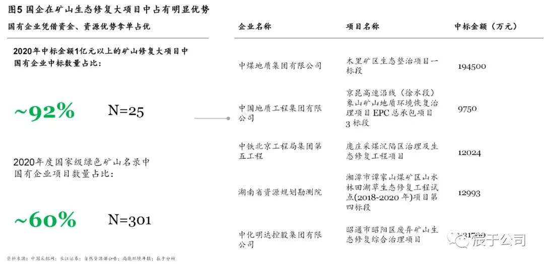 這四類企業(yè)中,具有國資背景的企業(yè)在大項(xiàng)目中標(biāo)占有明顯優(yōu)勢,據(jù)不完全統(tǒng)計(jì),2020年中標(biāo)金額1億元以上的礦山生態(tài)修復(fù)大項(xiàng)目中,90%以上為國有企業(yè);301個(gè)國家級綠色礦山名錄中,60%以上是國有企業(yè)(見圖5)。