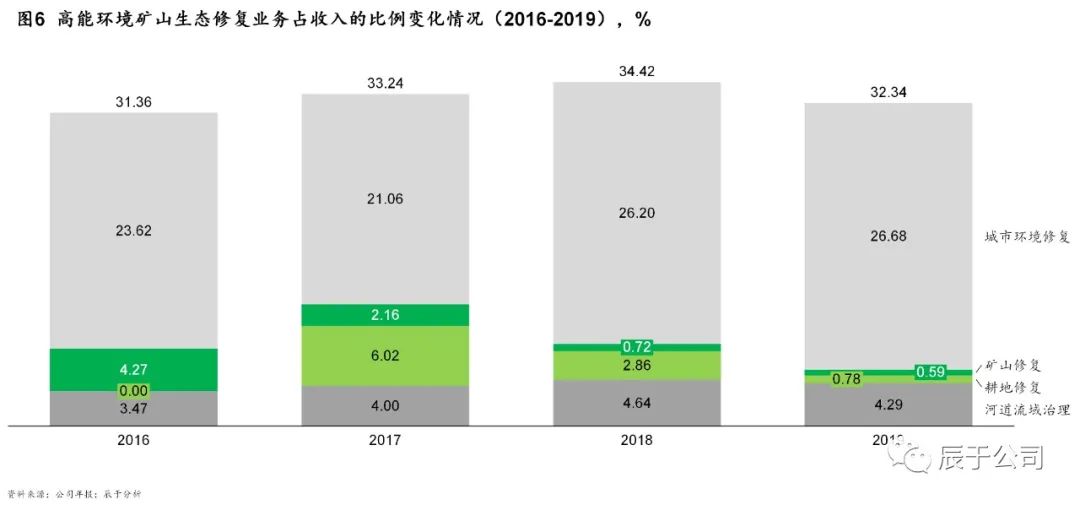 由于市場潛力并未有效釋放,領(lǐng)先的土壤修復(fù)企業(yè)參與這一市場較為謹(jǐn)慎,包括高能環(huán)境、中科鼎實(shí)、建工修復(fù)等龍頭在礦山生態(tài)修復(fù)領(lǐng)域的參與項(xiàng)目很少。以高能環(huán)境為例,近年來礦山生態(tài)修復(fù)占總收入的比重不升反降,2016年這一數(shù)字為4.27%,2019年則僅為0.59%(見圖6)。