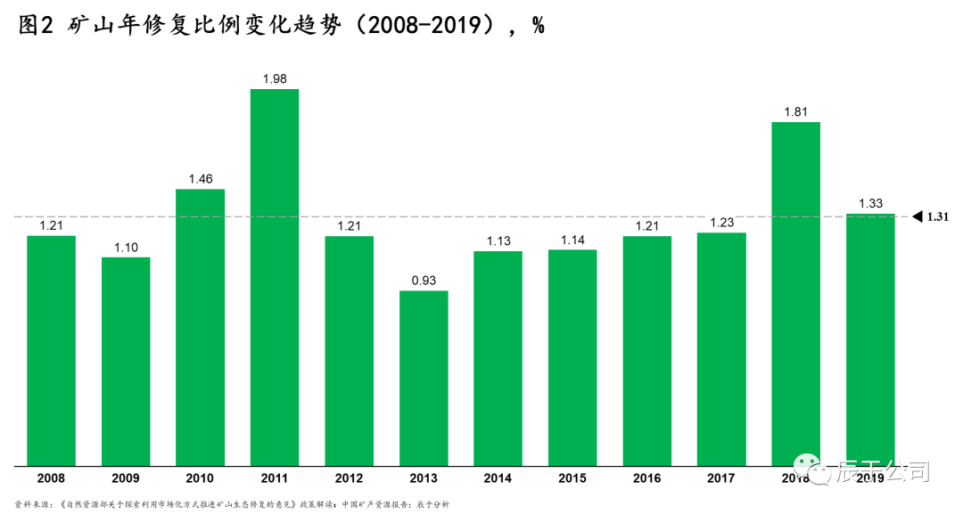 根據(jù)辰于測算,我國礦山生態(tài)修復(fù)市場未來十年的潛在空間6500億元以上,然而這一潛在市場一直并未有效釋放,過去十年我國每年礦山生態(tài)修復(fù)面積的比例均不高于2%,形勢并不樂觀。