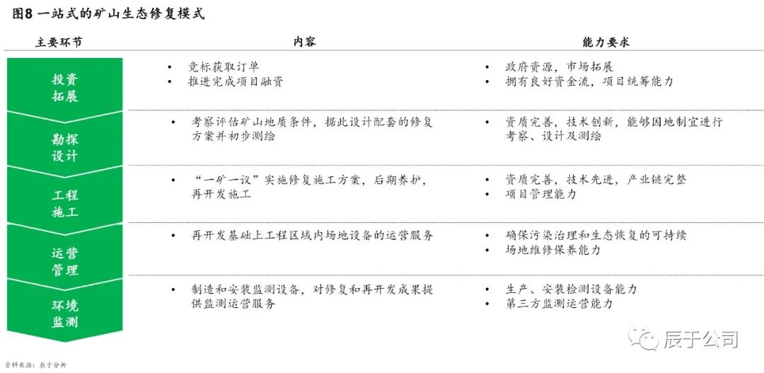 參考國際成熟經(jīng)驗(yàn),我們認(rèn)為未來EPC仍然是主流模式。不過隨著推進(jìn)大礦山生態(tài)修復(fù)勢在必行,預(yù)計(jì)PPP項(xiàng)目數(shù)量將有所增加,尤其是遼寧、河南、山東、內(nèi)蒙古等礦山生態(tài)修復(fù)走在前列的省份值得關(guān)注。當(dāng)然,這對入局企業(yè)也提出了更高要求,他們不僅要有較強(qiáng)的政府資源和市場拓展能力,還要關(guān)注礦山生態(tài)修復(fù)多環(huán)節(jié)的打通,提升諸如生態(tài)環(huán)境考察評估、破壞診斷、方案設(shè)計(jì)、修復(fù)系統(tǒng)構(gòu)造、生態(tài)景觀建設(shè)、系統(tǒng)跟蹤與維護(hù)、環(huán)境監(jiān)測等各項(xiàng)能力,打造一站式整體修復(fù)模式(見圖7)。