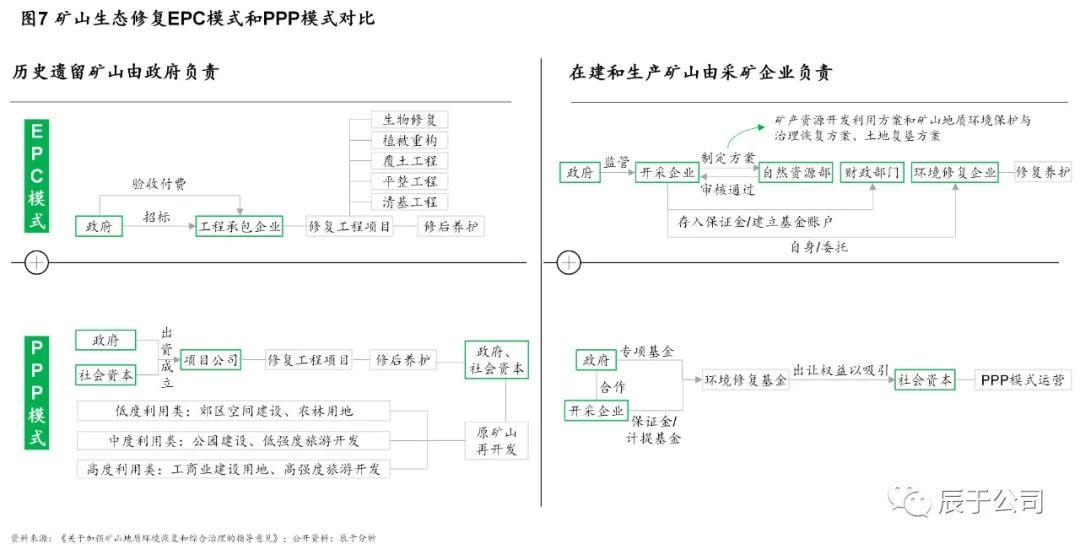 礦山生態(tài)修復(fù)主要有EPC和PPP兩種模式(見圖7),由于當(dāng)前的礦山生態(tài)修復(fù)主要依賴于各級地方政府規(guī)劃和中央及地方財(cái)政撥款,市場化程度不足,EPC是絕對主流模式,2020年的占比超過90%。這些EPC項(xiàng)目普遍工期短(多數(shù)項(xiàng)目工期在30到200天),以工程為主要內(nèi)容(多為清基、平整、覆土、植被重構(gòu)等)、復(fù)雜度低,主要以工程為盈利點(diǎn),基本無后期運(yùn)營。