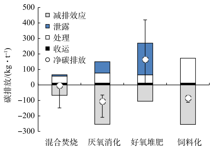 在廚余垃圾處理過程中,附加碳排放一般不到 50 kg·t?1,收運過程的碳排放也相對較小,因此系統(tǒng)熱效率、有機質(zhì)降解率和溫室氣體泄漏率是影響不同處理模式碳排放的主要因素。飼料化和厭氧消化具有最好的碳減排效應(yīng),而混合焚燒的碳減排效應(yīng)可忽略不計。好氧堆肥受到溫室氣體泄漏的影響,會產(chǎn)生較多的碳排放,當(dāng)堆肥工藝運行良好,無 CH4 和 N2O 排放時,好氧堆肥可產(chǎn)生碳減排效應(yīng)。
