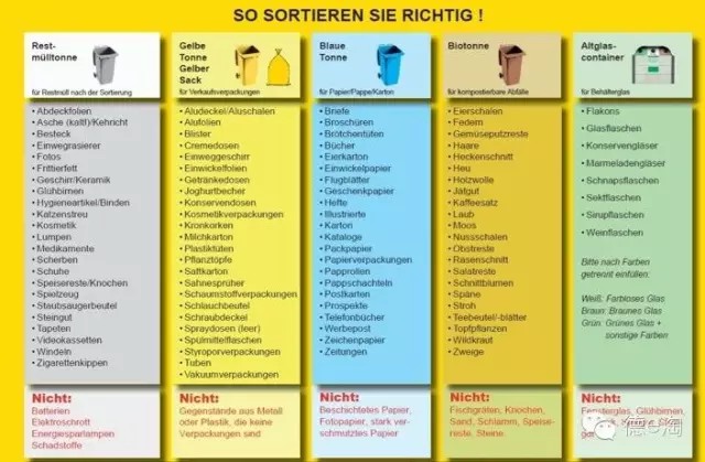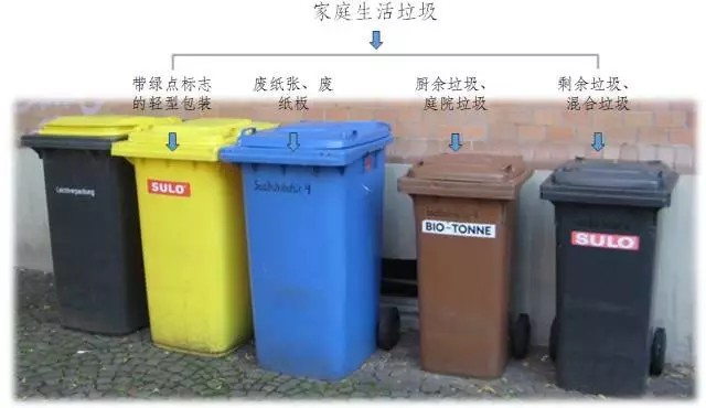 德國(guó)生活垃圾分類多采用“五分法”,即將生活垃圾分為以下五大類分別扔入不同顏色垃圾桶:棕色桶裝有機(jī)垃圾(包括剩飯剩菜、果皮骨頭等廚余垃圾,庭院綠化垃圾);黃色桶(或袋)裝輕型包裝(如塑料袋,包裝盒,牛奶盒等);藍(lán)色桶收集廢紙與廢紙箱;廢玻璃經(jīng)過分類后分別投入棕色、白色、綠色三種顏色的垃圾桶;剩余黑色或灰色的桶,用來收集所有居民分到無法再分的剩余垃圾。