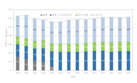 德國(guó)的生活垃圾處理方式總體可以歸為四類:填埋、有能量回收的焚燒、堆肥/發(fā)酵和回收利用,上圖反映了2001-2014年德國(guó)城市生活垃圾按不同方式的處理量。進(jìn)入21世紀(jì)以來,德國(guó)城市生活垃圾的直接回收利用率和有機(jī)處理(堆肥發(fā)酵)率都有穩(wěn)步提升,直接回收利用率的增長(zhǎng)更為顯著,從2001年的37.7%增長(zhǎng)至2014年的46.6%。從2001年至2005年,德國(guó)的生活垃圾填埋量逐年下降,尤為值得注意的是,到2006年,生活垃圾填埋處理的占比已經(jīng)不足1%,這標(biāo)志著德國(guó)城市生活垃圾正式開始進(jìn)入“零填埋”時(shí)代。這一轉(zhuǎn)變與德國(guó)2005年頒布的《垃圾填埋條例》是密切相關(guān)的,根據(jù)條例,垃圾填埋基本只接收經(jīng)過垃圾生物處理或焚燒處理后的灰渣,因此大幅降低了生活垃圾的填埋量。