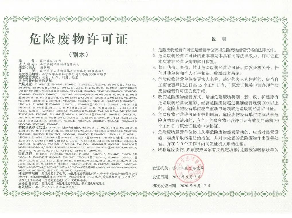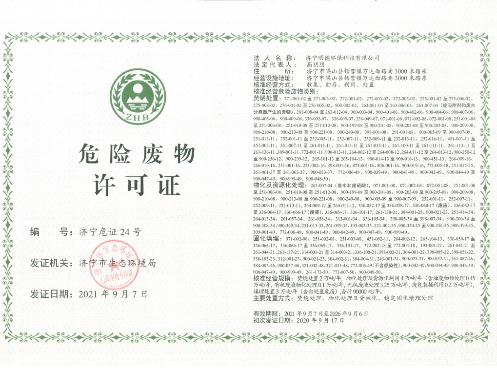 9月10日,雅居樂環(huán)保集團(tuán)旗下濟(jì)寧明德環(huán)??萍加邢薰?以下簡稱“濟(jì)寧明德項(xiàng)目”)喜獲濟(jì)寧市生態(tài)環(huán)境局頒發(fā)的5年期《危險(xiǎn)廢物許可證》。這也是當(dāng)?shù)貎H有的兩張5年期《危險(xiǎn)廢物許可證》之一。