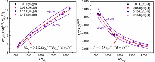 濕工質(zhì)中的含濕量顯著影響微通道回?zé)崞鞯膿Q熱性能,為了分析含濕量的定量影響,研究人員構(gòu)建了翼型-直通道新型耦合流動換熱單元三維數(shù)理模型,討論了含濕量、流量和溫度等因素對耦合換熱的影響規(guī)律,對比了翼型結(jié)構(gòu)與直通道、之字形結(jié)構(gòu)的綜合流動換熱性能。研究表明,增加含濕量可以提高高壓空氣的整體流動換熱特性;在等泵功的條件下,交錯排列的翼型翅片相比較于直通道和之字形通道具有最好的熱工水力特性?;诟晒べ|(zhì)經(jīng)驗關(guān)聯(lián)式,引入含濕量強(qiáng)化換熱因子,建立了高溫含濕煙氣和高壓濕空氣流動換熱特性與含濕量的定量關(guān)聯(lián)式,定量描述了含濕量對傳熱和壓降特性的影響規(guī)律(見圖2)。