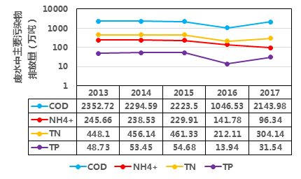 根據(jù)2013-2017年《中國統(tǒng)計年鑒》,我國廢水排放總量保持在700億噸,其中廢水中COD、氨氮(NH4+)、總氮(TN)、TP排放量如下圖,可見2015年國務院發(fā)布了《水污染防治行動計劃》(簡稱“水十條”)后,這幾種污染物排放量得到了削減。