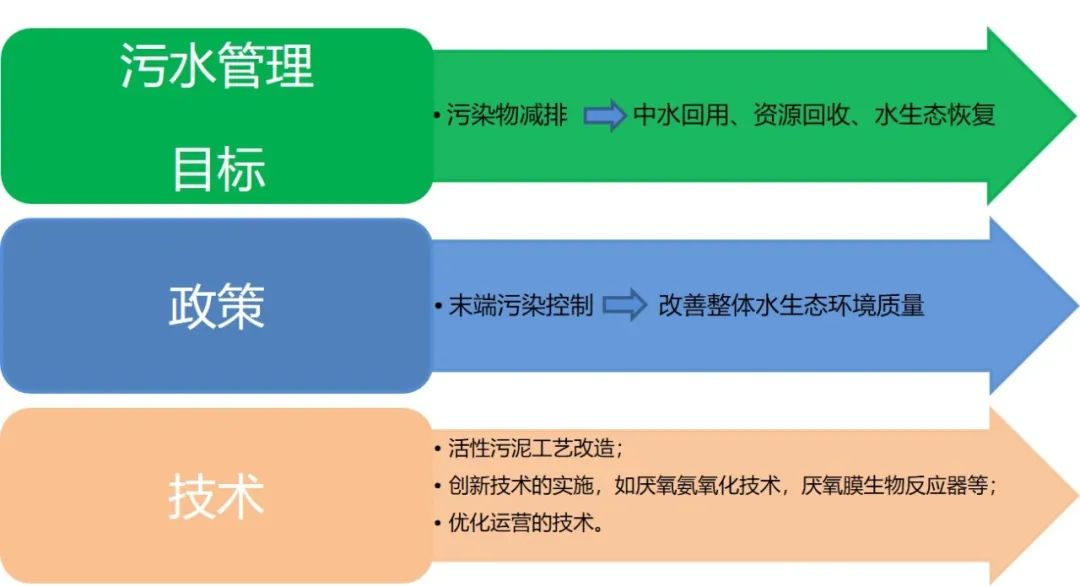 近幾十年來,中國污水行業(yè)經(jīng)歷了高速增長,在基礎設施建設、技術創(chuàng)新、人才培養(yǎng)等方面取得了進步,為未來的智慧化、低碳化、資源化發(fā)展奠定了堅實的基礎。然而,未來仍然充滿不確定性和挑戰(zhàn)。預計隨著人口的持續(xù)增長和城市化進程,水資源短缺將更加嚴重,而污水量將進一步增加。這將要求污水管理目標、政策和技術發(fā)生根本性變化,如下圖: