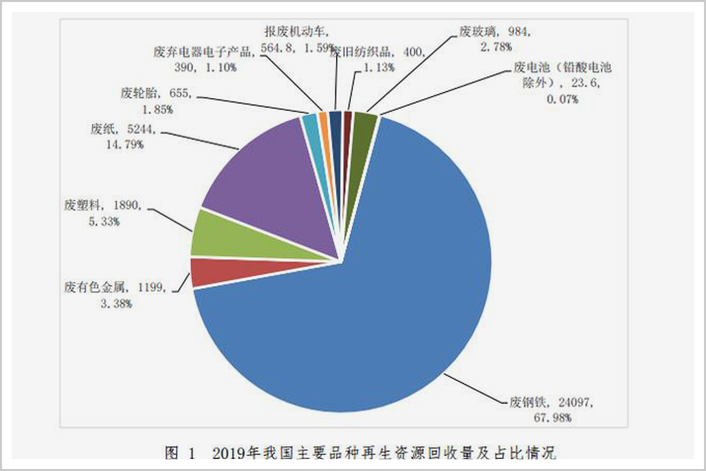 據(jù)商務(wù)部《中國再生資源回收行業(yè)發(fā)展報告(2020)》,我國可再生資源回收主要集中在廢鋼鐵、廢有色金屬、廢塑料、廢輪胎、廢紙、廢棄電器電子產(chǎn)品、報廢機動車、廢舊紡織品、廢玻璃、廢電池等領(lǐng)域,2019年底,它們的回收總量超過3.5億噸。