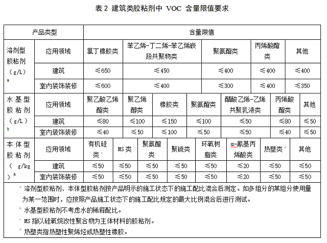 5.2 建筑類膠粘劑中 VOC 含量限值應符合表 2 的要求。