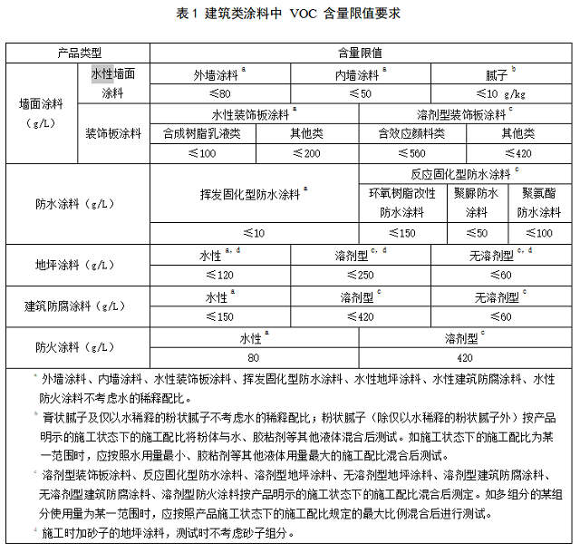 5.1 建筑類涂料中 VOC 含量限值應符合表 1 的要求。