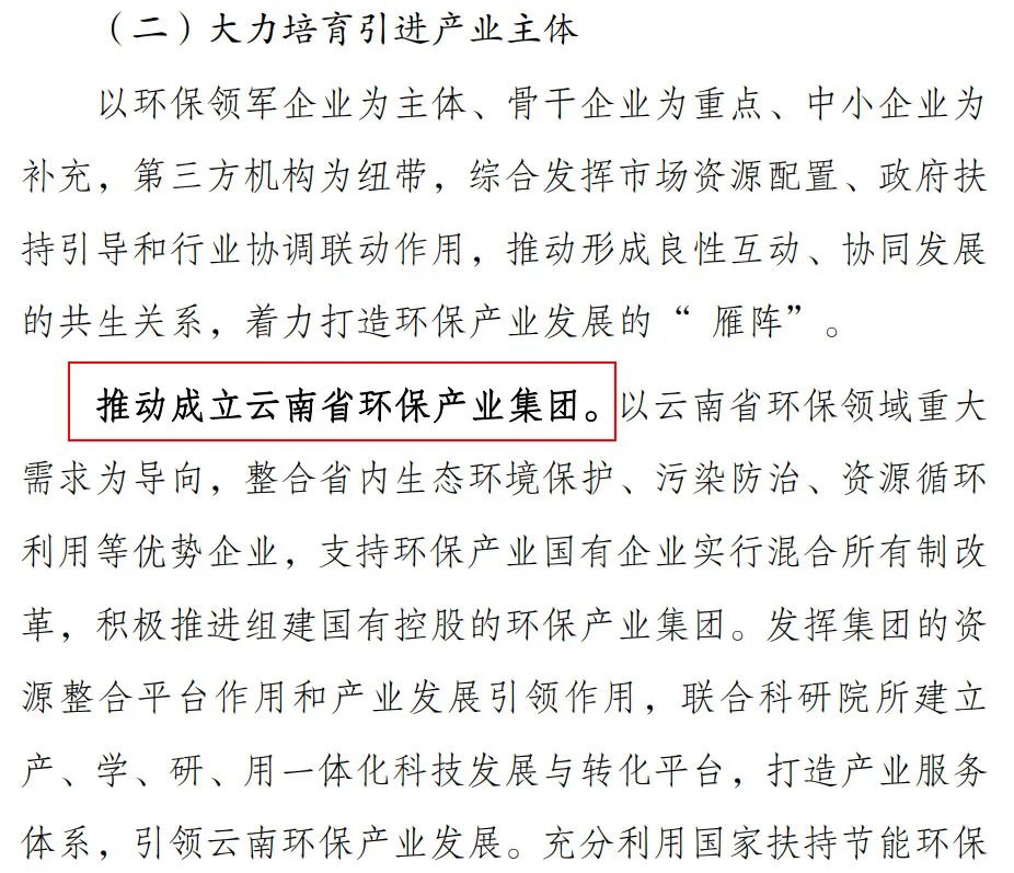 不過,這個“福建省生態(tài)環(huán)保集團”到底什么時候組建完成,其中都包括什么內(nèi)容,一切具體的信息就都不知道了。還有云南,今年7月,云南省發(fā)布《云南省“十四五”環(huán)保產(chǎn)業(yè)發(fā)展規(guī)劃(征求意見稿)》,其中提到,要推動成立云南省環(huán)保產(chǎn)業(yè)集團。以云南省環(huán)保領(lǐng)域重大需求為導向,整合省內(nèi)生態(tài)環(huán)境保護、污染防治、資源循環(huán)利用等優(yōu)勢企業(yè),支持環(huán)保產(chǎn)業(yè)國有企業(yè)實行混合所有制改革,積極推進組建國有控股的環(huán)保產(chǎn)業(yè)集團。
