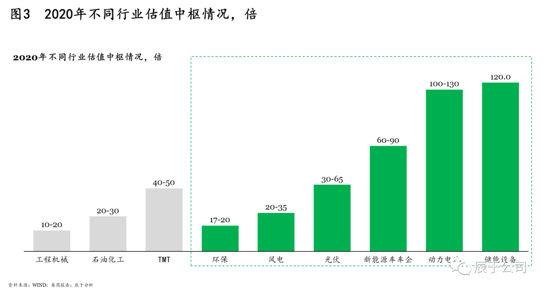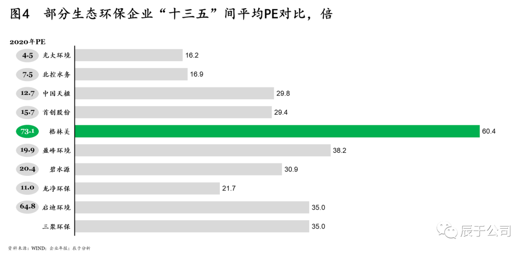 不難發(fā)現(xiàn),不同行業(yè)的估值中樞相差很大,例如能源類與生態(tài)環(huán)保類之間就相差2-6倍(圖3),因此,具有多類業(yè)務或有轉(zhuǎn)型意向的生態(tài)環(huán)保企業(yè)可在行業(yè)定性上多加考慮。