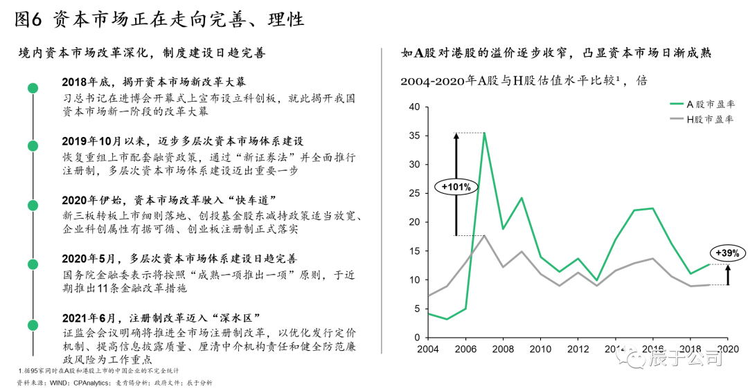 政策推動下,國內(nèi)資本市場改革逐步深化,制度建設日趨完善,生態(tài)環(huán)保企業(yè)面臨的資本市場大環(huán)境正走向理性。A股對H股的溢價逐步收窄便是其中一佐證:基于對95家同時在A股和港股上市的企業(yè)的分析,可以看到相比于2006年最高峰時A股對H股超過100%的溢價,當前30%-40%的溢價已有明顯收窄(見圖6)。