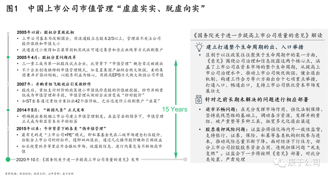我國于2005年首次提出“市值管理”概念,但以此為名,資本市場長期出現(xiàn)各類“偽市值管理”亂象,包括背后交易拉抬股價、鼓噪并購重組吸引“韭菜”入場等,迫使政策不斷調(diào)整以規(guī)范市場,直到2020年10月,國務院發(fā)布《關于進一步提高上市公司質(zhì)量的意見》(以下簡稱《意見》),政策上打通了上市公司在資本市場的整個生命周期、部署了之前長期未解決問題的應對措施,因而也對上市公司提出了更高要求,市值管理開始“脫虛向?qū)崱保ㄒ妶D1)。