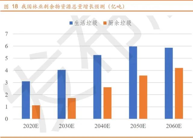 根據(jù)住建部發(fā)布的《中國城鄉(xiāng)建設(shè)統(tǒng)計年鑒》數(shù)據(jù),當(dāng)前生活垃圾清運 量約為 3.1 億噸,近年垃圾清運量增長率約為 3%。近年來,我國廚余垃圾清 運量持續(xù)保持 3.6%增長。同時由于垃圾分類工作持續(xù)推進,濕垃圾從生活垃 圾中分離出來,廚余垃圾比重逐步提高。以上海為例,自垃圾分類實施以來, 到 2020 年底,濕垃圾占比達到 31%左右。隨著我國城市化進程的不斷推進, 人民生活水平的不斷提高,預(yù)計垃圾產(chǎn)生量也會逐年提升,保持穩(wěn)步增長, 并達到發(fā)達國家人均垃圾產(chǎn)生量水平。根據(jù)世界銀行相關(guān)數(shù)據(jù),人均垃圾產(chǎn) 生量與人均 GDP 有較高相關(guān)性,其中高收入人口人均垃圾產(chǎn)生量為 1.58 千 克/日,根據(jù)測算,預(yù)計到 2045 年我國垃圾清運量將達到飽和,到 2060 年我 國生活垃圾產(chǎn)生潛力峰值約為 10.05 億噸。生活垃圾清運量預(yù)計 2030 年將達 到 4.04 億噸,2060 年將達到 5.86 億噸。假設(shè) 2030 年全面垃圾分類實施區(qū) 域達到 10%,廚余垃圾清運量將達到 1.72 億噸,到 2060 年全面垃圾分類實 施區(qū)域達到 50%,廚余垃圾清運量將達到 4.19 億噸。