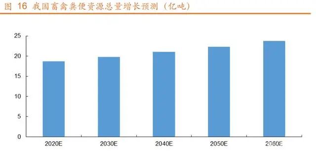 廣義上畜禽糞便為畜禽排出的糞尿為主。目前,根據(jù)《中國農(nóng)業(yè)年鑒》、 《中國農(nóng)村統(tǒng)計年鑒》、《中國畜牧獸醫(yī)年鑒》以及國家統(tǒng)計局最新畜禽存欄 數(shù)據(jù)測算,我國畜禽糞便資源量共計 18.68 億噸(不包含沖洗廢水)。根據(jù)年 鑒統(tǒng)計數(shù)據(jù),近年來我國主要畜禽類存欄量呈現(xiàn)小幅震蕩,雖然在 2019 年到 低點后因擴大豬肉供給大幅反彈,總體上還是受短期市場因素影響。預(yù)計未 來肉蛋奶消費市場將趨于飽和,畜禽糞便資源量保持在固定區(qū)間內(nèi),畜禽糞 便資源量將保持 0.6%的較低增長趨勢。預(yù)計 2030 年畜禽糞便資源總量約為 19.83 億噸;2060 年畜禽糞便資源總量約為 23.73 億噸。
