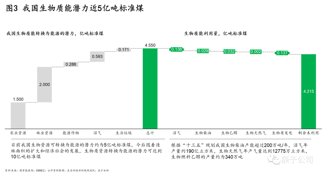 正因如此,我國生物質(zhì)能還處于發(fā)展的初級階段,潛力巨大。根據(jù)公開資料測算,當(dāng)前我國生物質(zhì)能每年可以利用的量將近5億噸標(biāo)準(zhǔn)煤,相較之下目前已經(jīng)利用的量只有不到0.4億噸標(biāo)準(zhǔn)煤,生物質(zhì)能是一座待持續(xù)發(fā)掘的能源寶庫,行業(yè)還有十幾倍的增長空間。