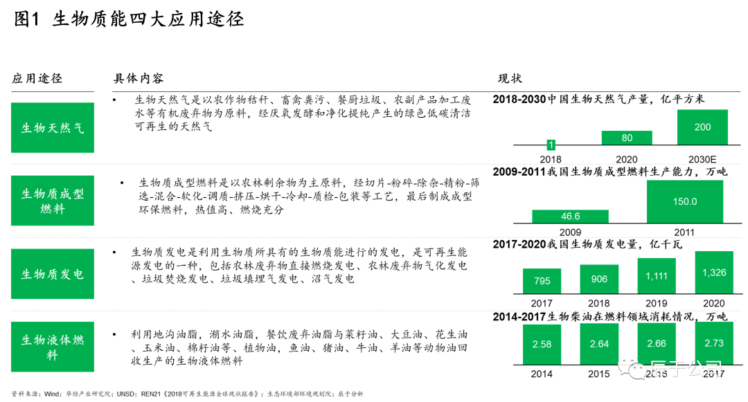 生物質(zhì)能是指太陽能以化學(xué)能形式儲存在生物質(zhì)中的能量形式,燒柴火便是對生物質(zhì)能的利用,自從人類學(xué)會了使用火,生物質(zhì)能就成為重要的能源來源之一。現(xiàn)代生物質(zhì)能行業(yè)進(jìn)一步對各種有機(jī)質(zhì)中的能源進(jìn)行加工和轉(zhuǎn)換,變成各類更易儲存、運(yùn)輸和使用的能源類型,具體可分為四大類別:生物天然氣,生物質(zhì)發(fā)電,生物質(zhì)成型燃料,生物液體燃料。這四類均已有一定的發(fā)展基礎(chǔ)(見圖1)。